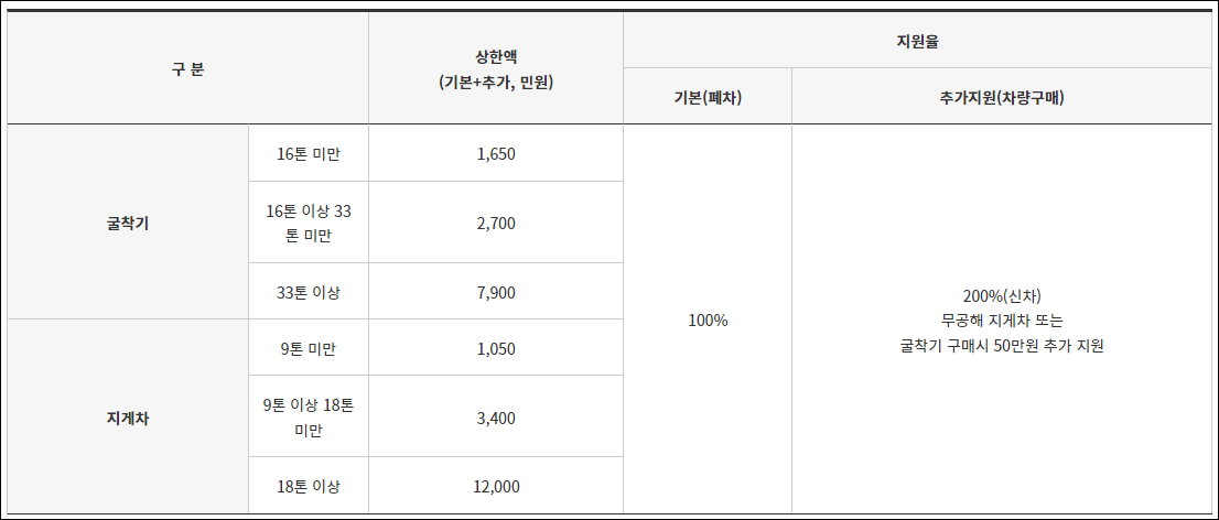 지게차와 굴착기의 조기폐차 지원금 상한액 및 지원율은 아래 표를 참고해 주세요. 건설기계, 지게차, 굴착기 모두 차주가 저소득층이거나 소상공일 경우 추가 지원금 100만 원을 받을 수 있습니다.