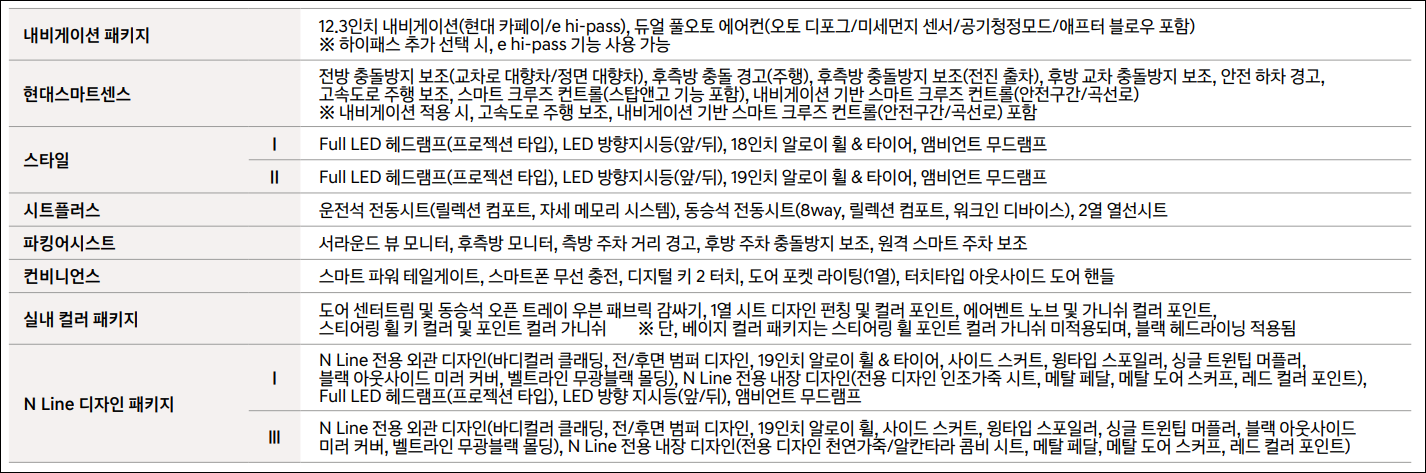 패키지 옵션도 N Line 디자인 패키지 Ⅱ 외에는 일반 모델과 거의 동일하니 참고해 주시기 바랍니다.